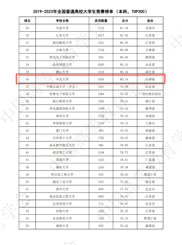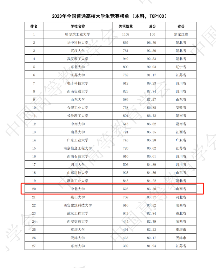 3月22日,教育部中国高等教育学会发布了全国普通高校大学生竞赛第八轮榜单,我校表现出色,以奖项数量525项,总分83.5分的成绩在2023年全国普通高校大学生竞赛榜单(本科,TOP100)中位列全国第20位,山西省首位。在2019-2023年全国普通高校大学生竞赛榜单(本科,TOP300)位列全国第36位。